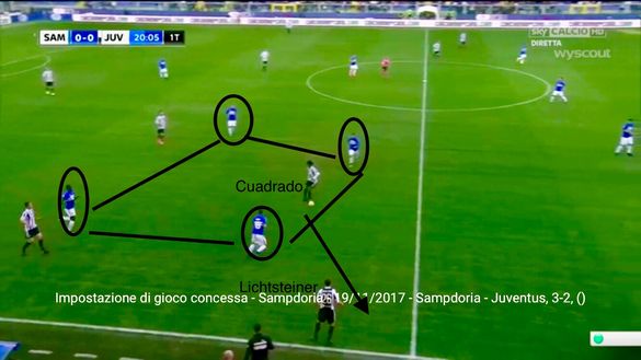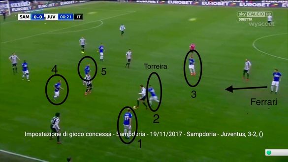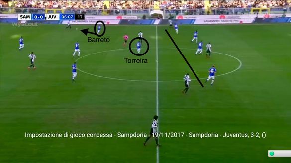 Cuadrado riceve il pallone dal centrale di difesa, la Sampdoria si dispone a "rombo", creando densità, con Torreira che accorcia subito dietro a Cuadrado, obbligando il colombiano ad appoggiarsi sulla fascia per Lichtsteiner. Il passaggio sarà dosato male e quindi sbagliato, con la Samp che recupera il possesso.