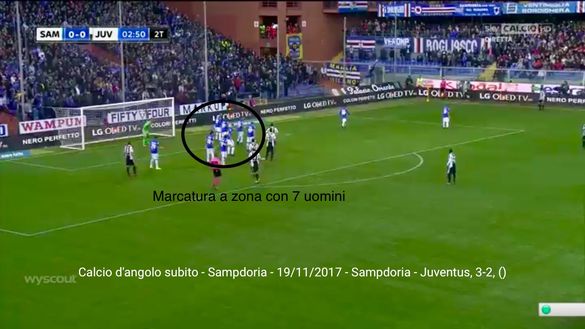 Anche nei calci d'angolo a sfavore la Sampdoria si posiziona in marcatura a zona con ben 7 uomini. L'unico a marcare a uomo in area di rigore è Bereszynski. Tutti i dieci giocatori di movimento partecipano alla fase di difesa del calcio d'angolo.